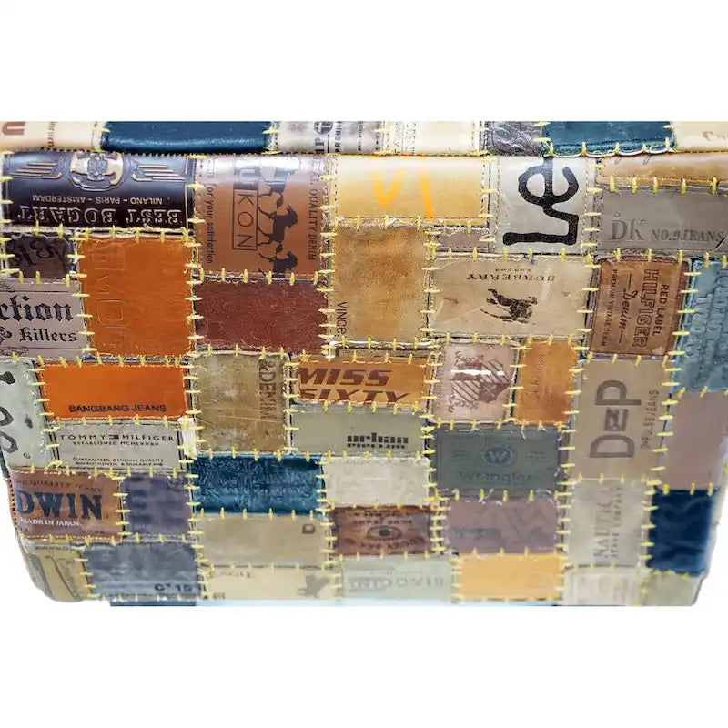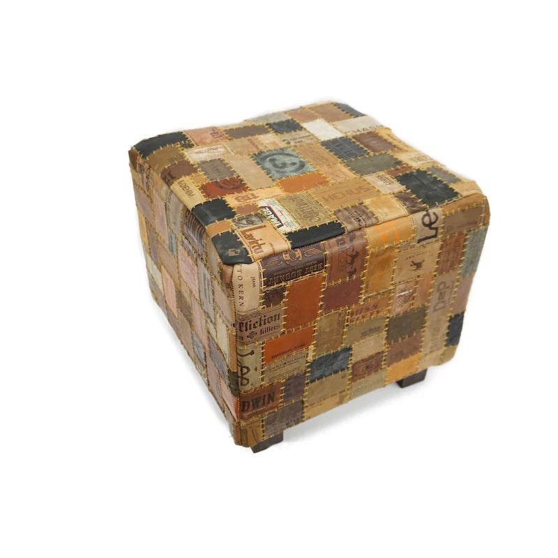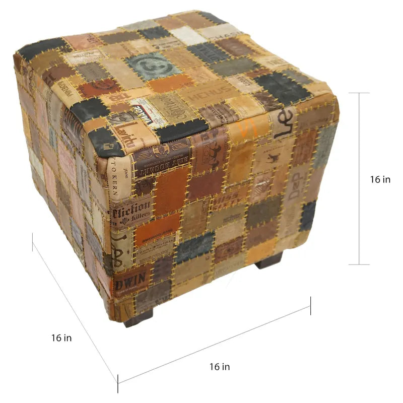 Handcrafted leather cube pouf with 225lb weight capacity. Functions as footstool, extra seating, or side table. Each piece features unique design patterns.