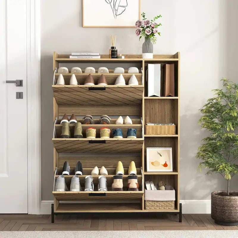 This shoe cabinet is perfect for your entryway, hallway, living room, or porch. With 3 flip doors, it provides hidden storage for your shoes while maintaining a modern and rustic design. The carved arrow detailing in rustic light brown and white gold complements any home style. Keep your home neat and save space with this stylish shoe cabinet.