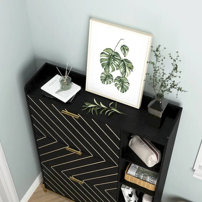 Our freestanding shoe cabinet features space-saving flip drawers that are easy to open and close. Unlike ordinary shoe racks, this narrow cabinet can fit into small spaces, keeping your shoes dust-free and protected from pets and bugs. Enjoy a clutter-free and organized entryway with this modern shoe cabinet.