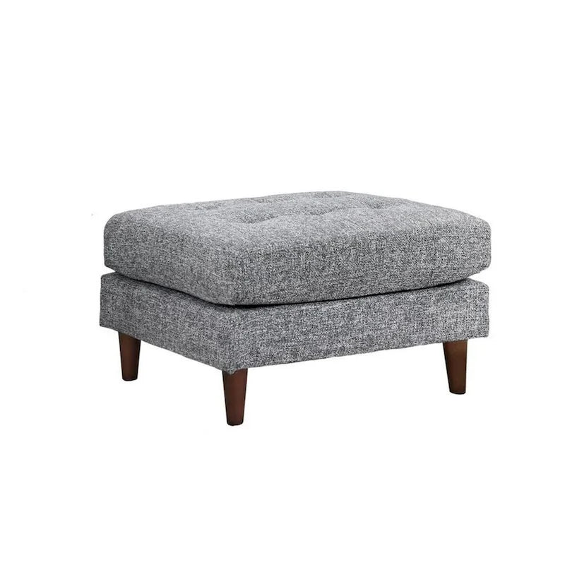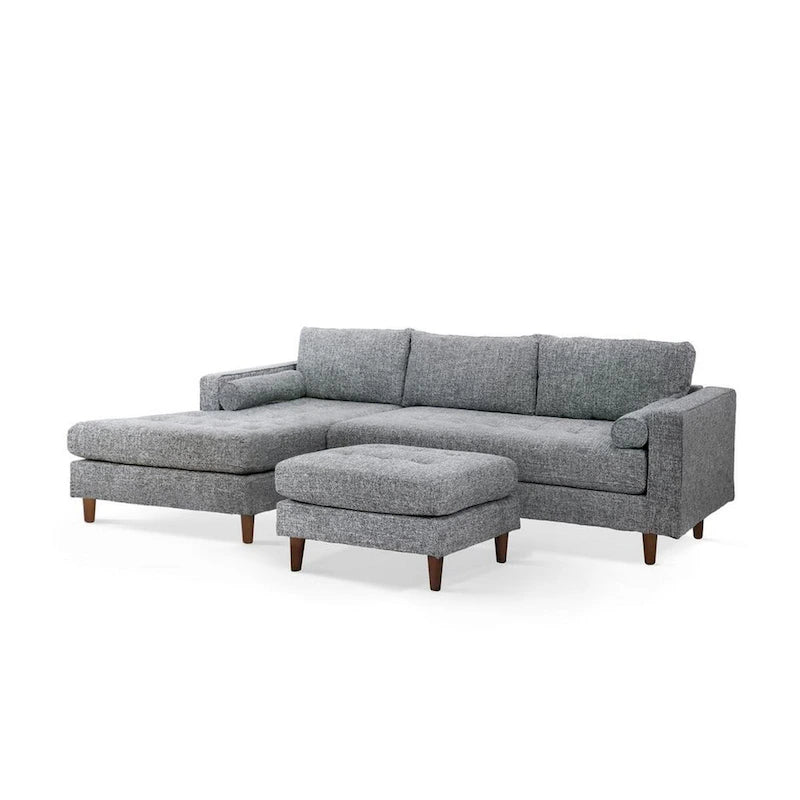 Reversible sectional sofa in gray woven fabric. Includes chaise, ottoman, and two bolster pillows. Wood frame with walnut brown legs.