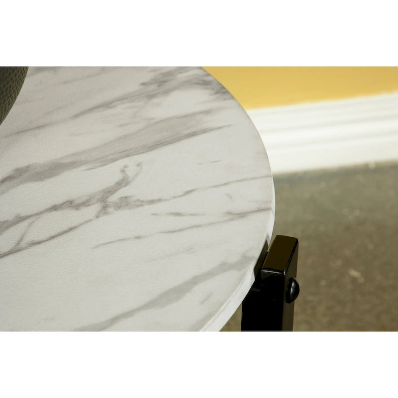 With an industrial modern flair and classical elements, this contemporary end table offers a strikingly minimalist touch placed beside chairs, sofas and more. Boasting with a faux white marble round tabletop that contrasts against a black finish three-legged base, this chic contemporary end table lends itself to a variety of color palettes and decor styles, offering transitional colors and sleek, understated elegance.