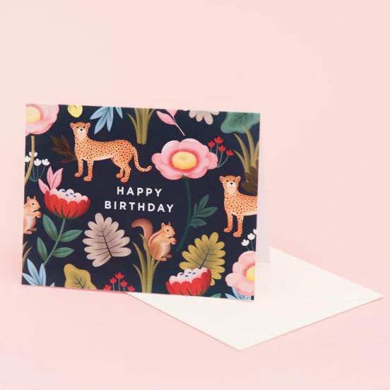 Souhaitez un joyeux anniversaire à quelqu'un avec cette carte ornée de fleurs et de créatures du règne animal.