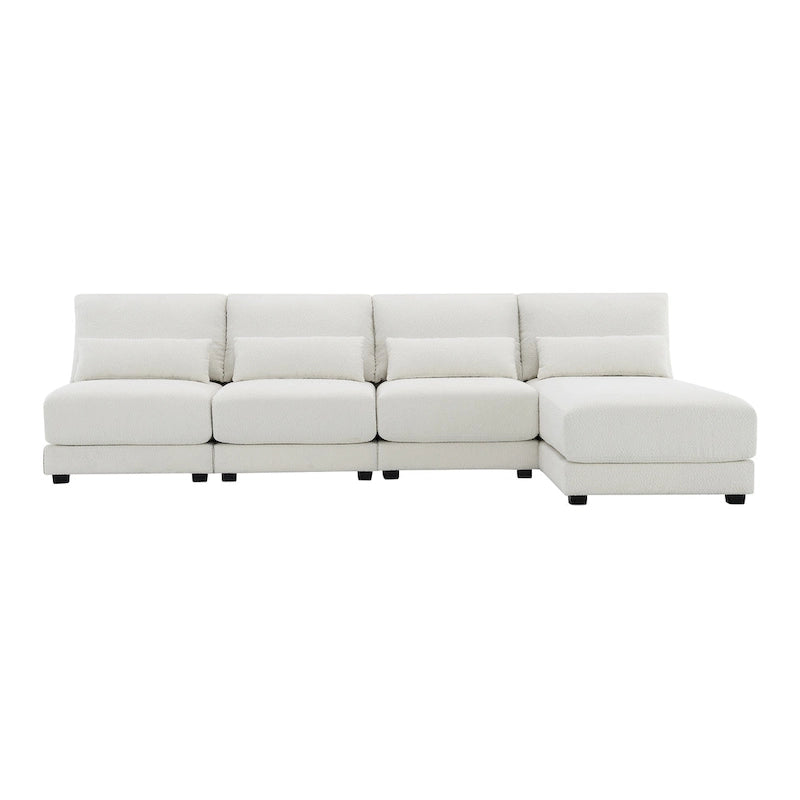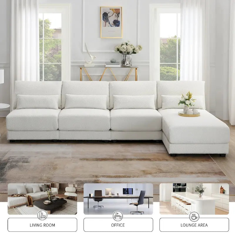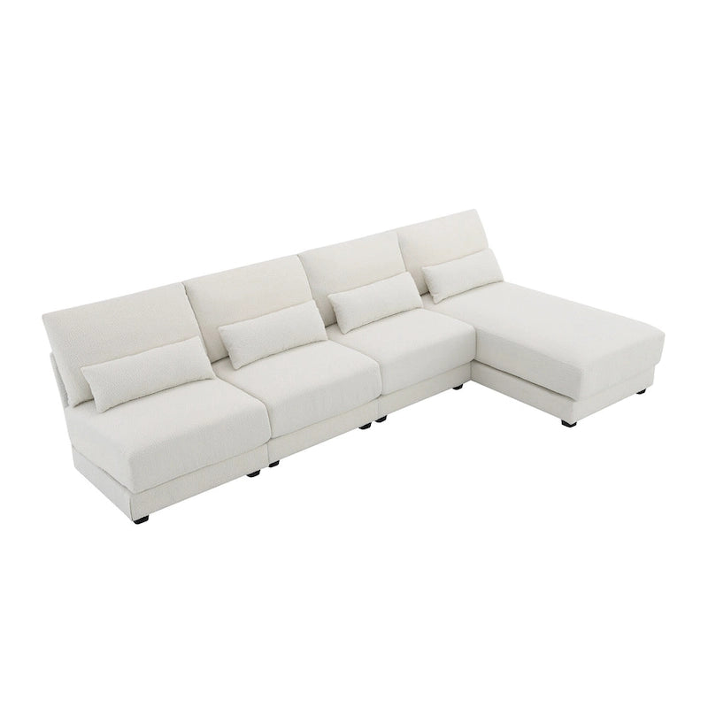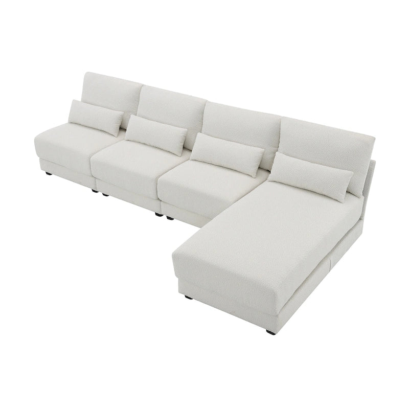 L-shaped sectional sofa with reversible chaise lounge. Upholstered in beige boucle fabric with foam and pocket spring cushioning. Includes 4 pillows.