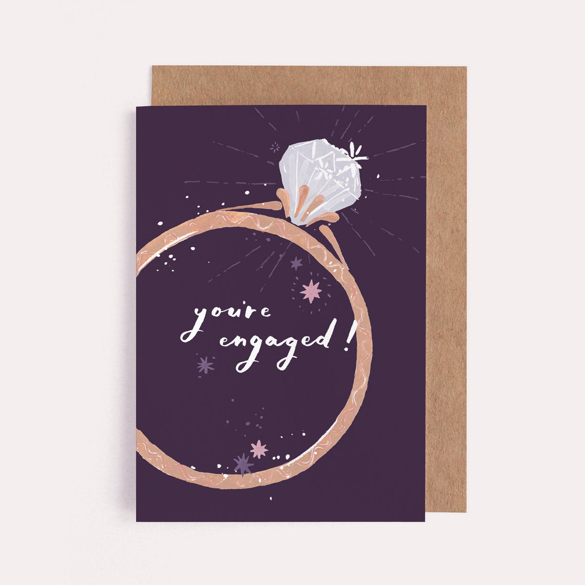 Carte de fiançailles illustrée d'une bague en diamant étincelante.