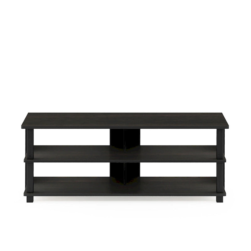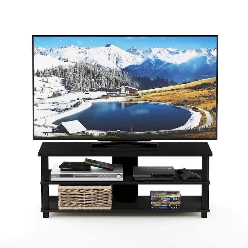Modern 3-tier TV stand in espresso brown finish. Supports TVs up to 50 inches wide. Made of wood with two open shelves for storage. Assembly required.