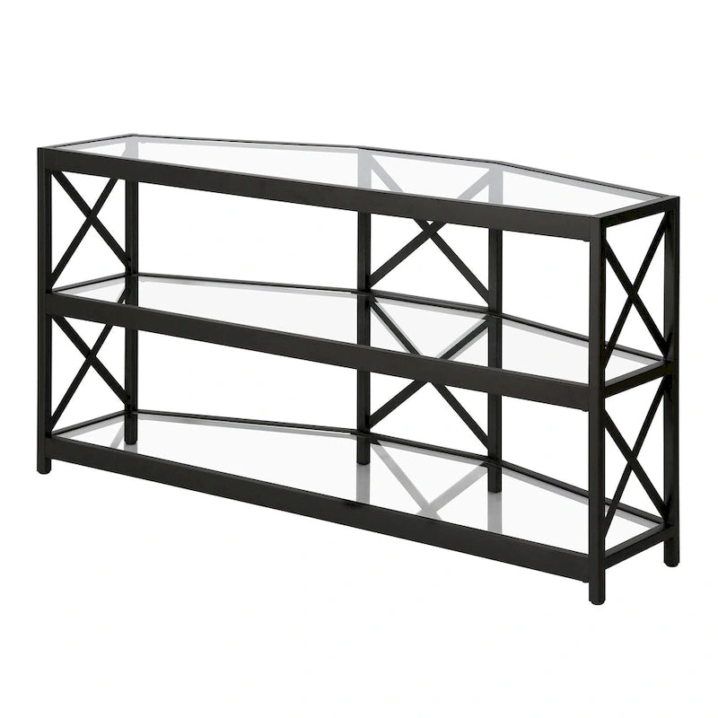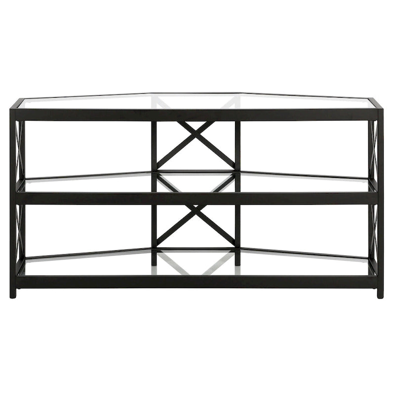 Make the most of your space with the clever shape of this five-sided TV stand. It's designed to nestle perfectly in the corner of your living room, bedroom, or den with plenty of clearance for your cord management situation. The luxe look of repeated geometric X's in rich metallic finishing bring this classic design ahead of the trend curve. Featuring a tempered glass top and shelves, this TV stand is streamlined and durable in any living room or den.