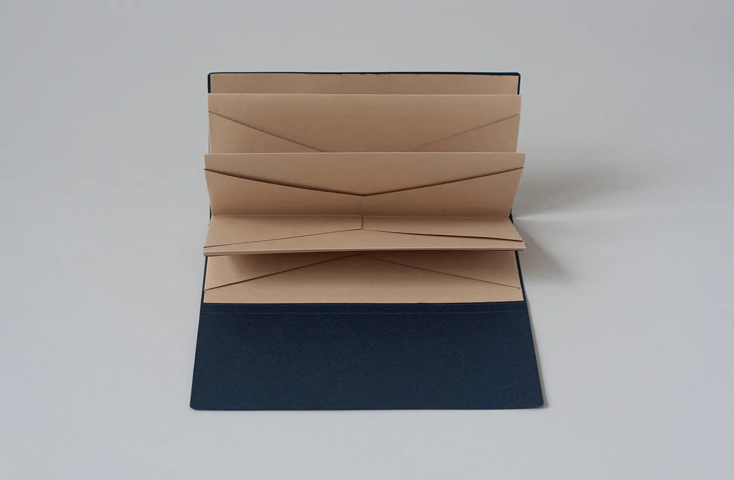 Les pochettes sont pliées et assemblées à la main, une par une. Les élastiques de fermeture ont également été teints sur mesure pour s'harmoniser avec les couleurs du papier de couverture.