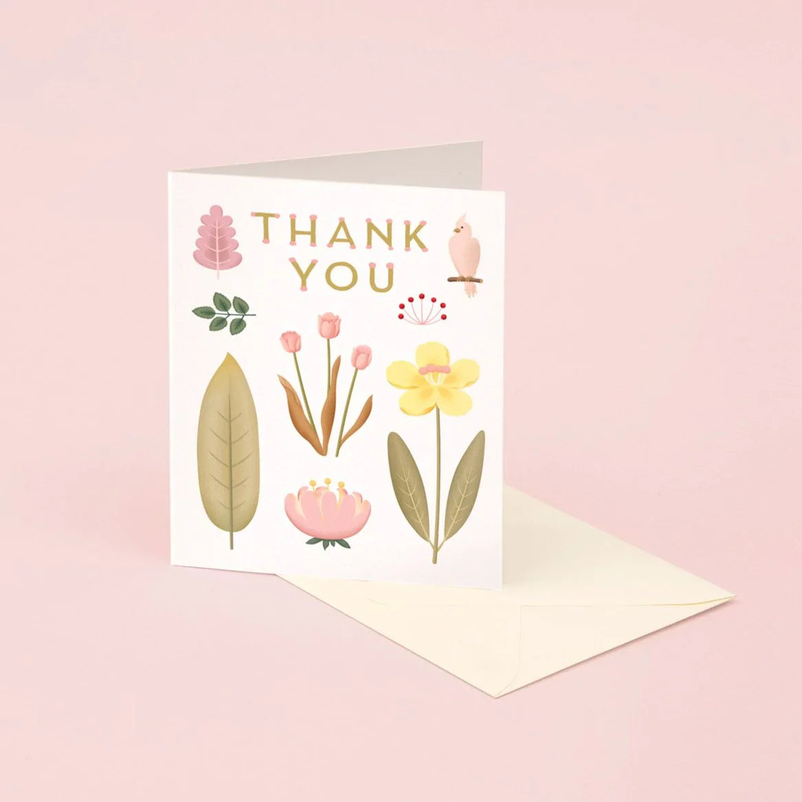 Exprimez votre gratitude avec cette jolie carte de remerciement ornée d'un adorable perroquet et d'un assortiment de fleurs fraîchement coupées.