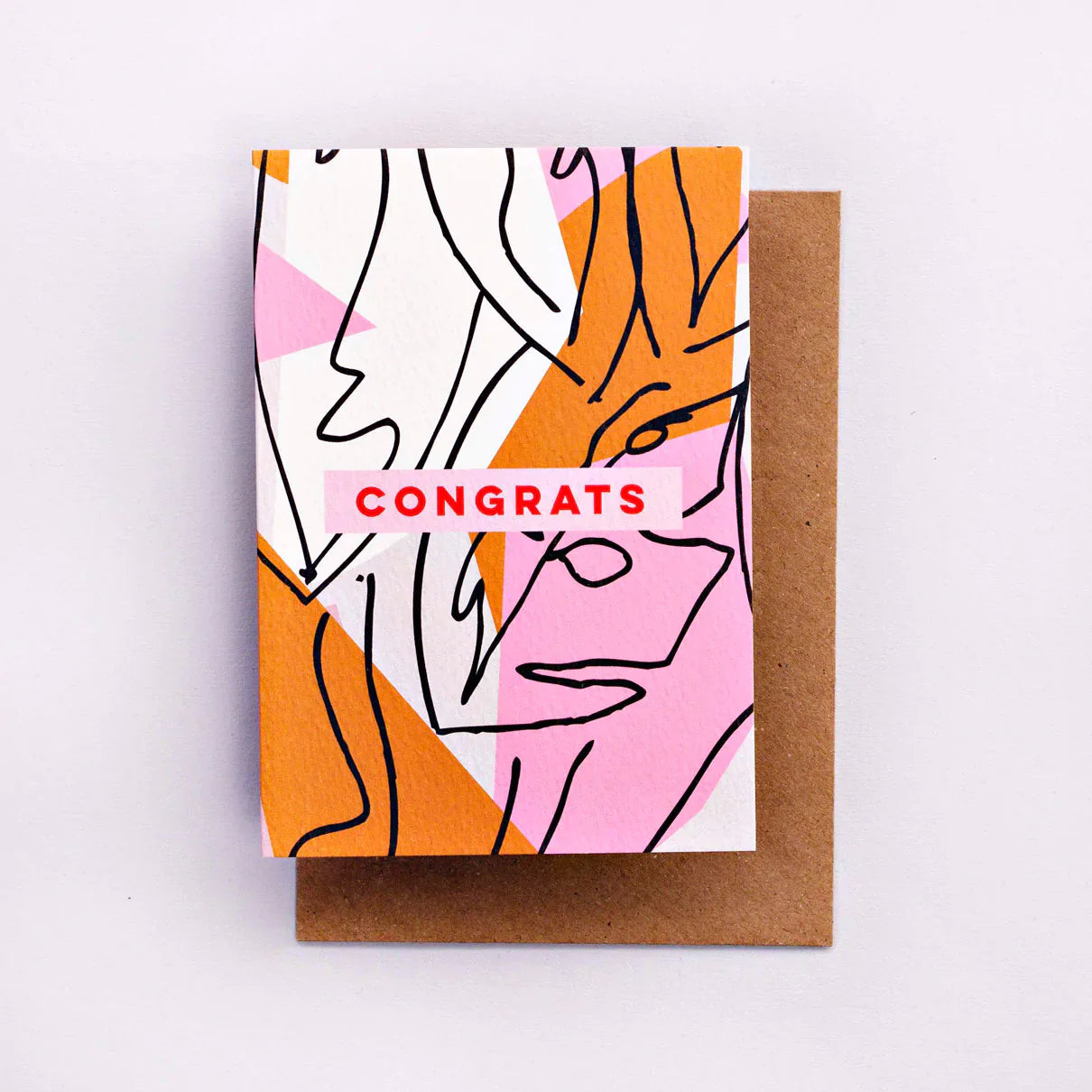 Voici une carte à motif botanique vraiment chouette, ni trop mièvre ni trop sage, avec ses jolies couleurs pastel. Elle arbore un message graphique simple et épuré sur le devant, dans des tons roses et moutarde.