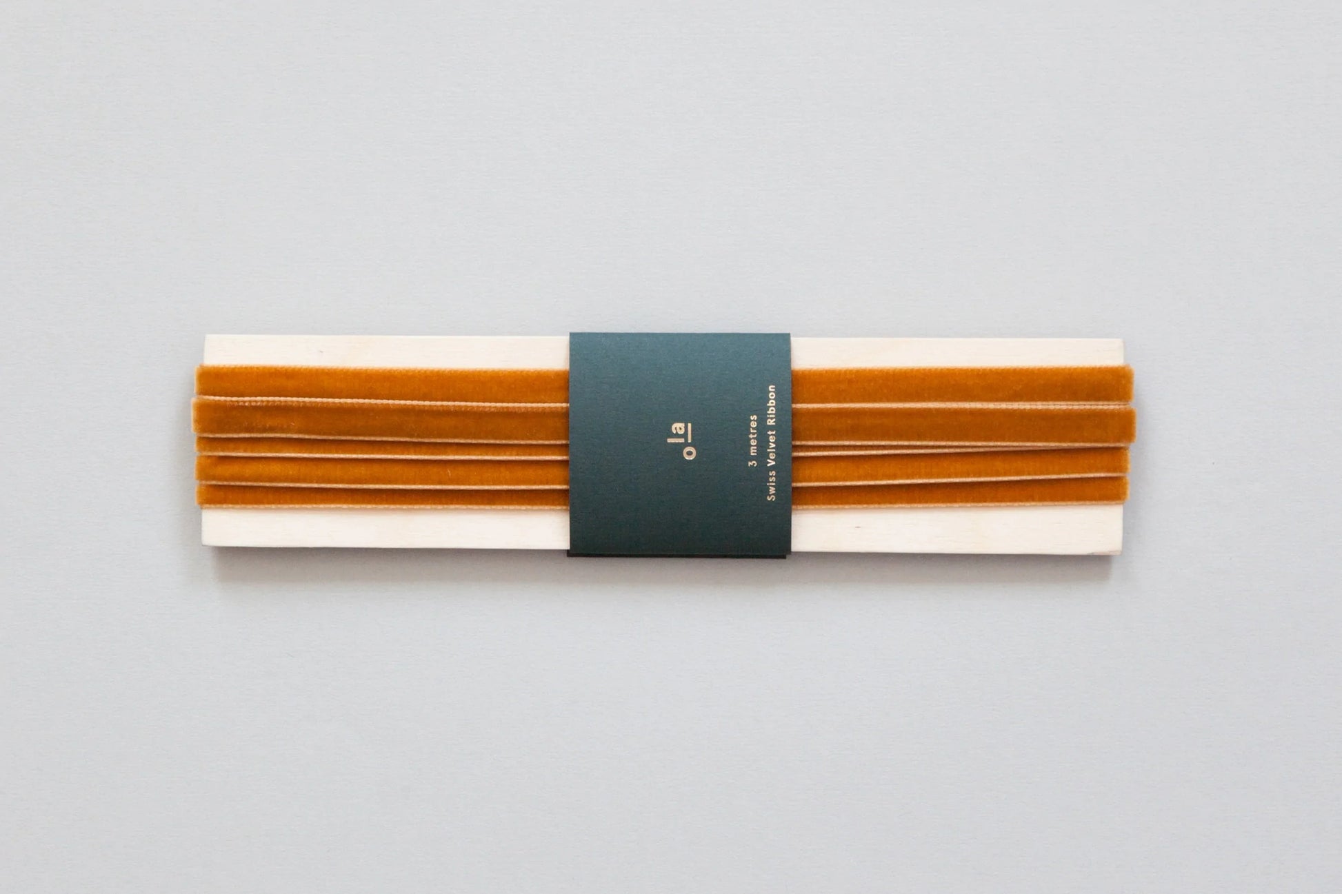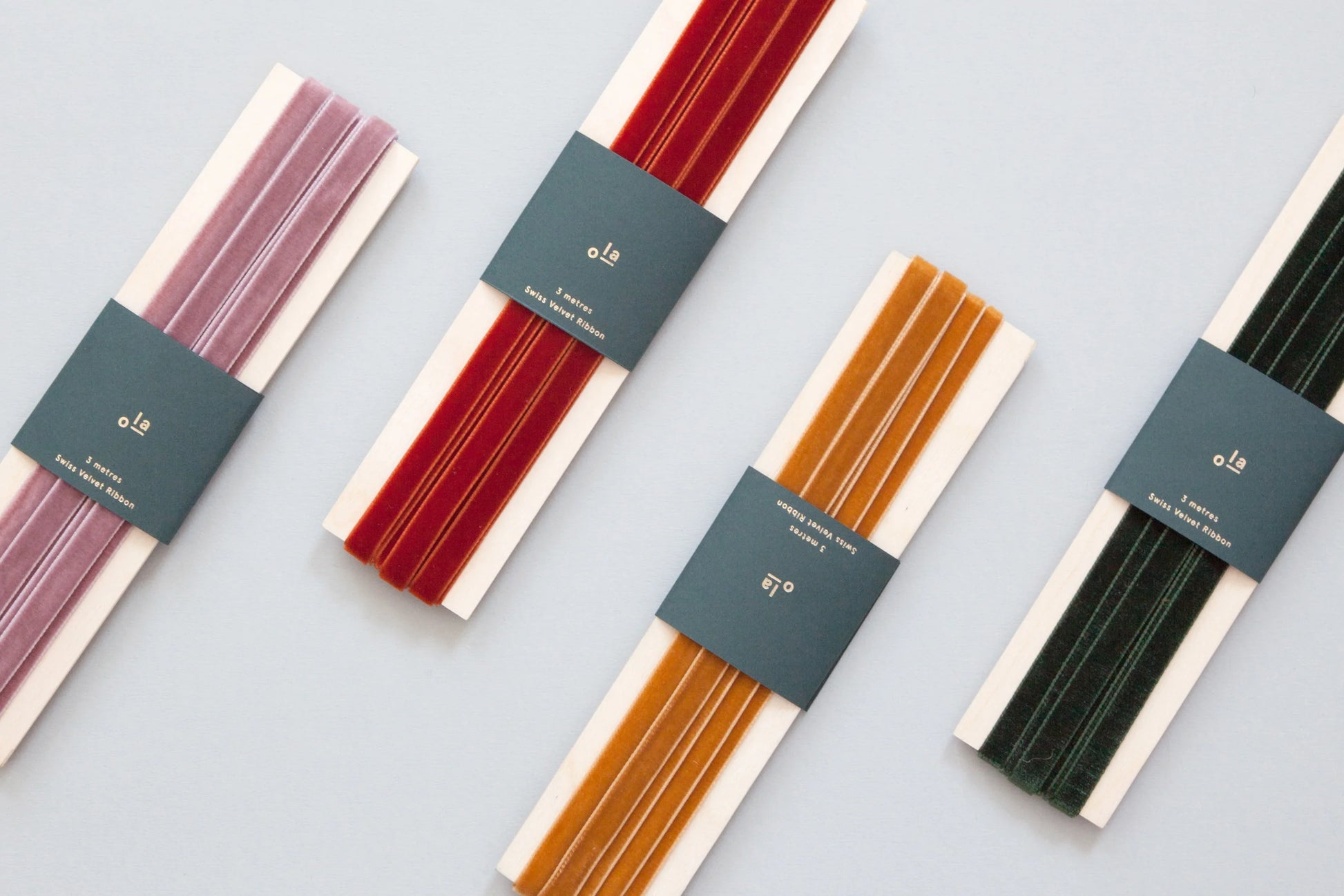 Ruban de velours suisse de luxe de trois mètres, présenté sur un dévidoir en bois avec une bande en laiton.