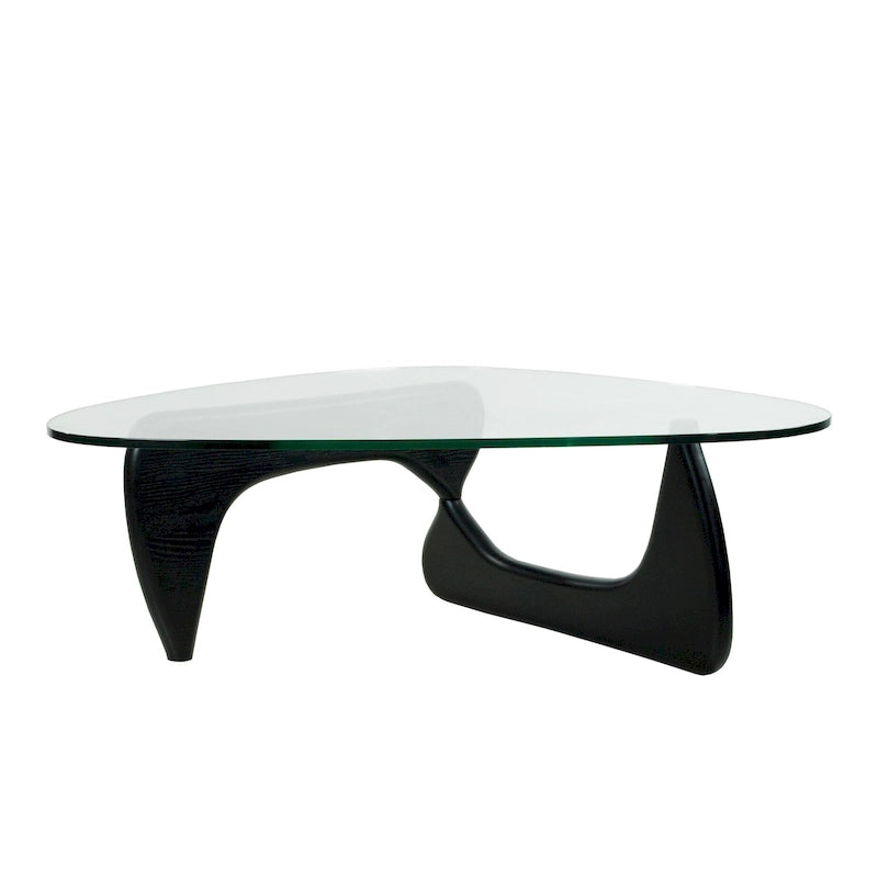 Triangle-shaped coffee table with 15mm tempered glass top and interlocked solid wood base. Suitable for living rooms, offices, and lounges.